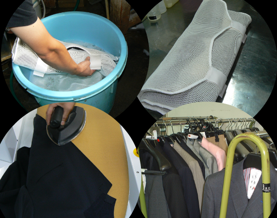 水溶性の汚れには弱いのです。汗や汗系の臭いは落ちません。「水洗いクリーニング」は、衣類の縮みが心配されますが、特殊な洗剤を使用することと、過程での絶妙な温度調整で極力縮みを無くし、後の手仕上げプレスで完全な仕上がりを見せます。水洗いされているので、臭いもなくすっきりとしていますし、汗はもちろん雨などの汚れも落ちます。生地を最良の状態に保つ唯一の方法です。